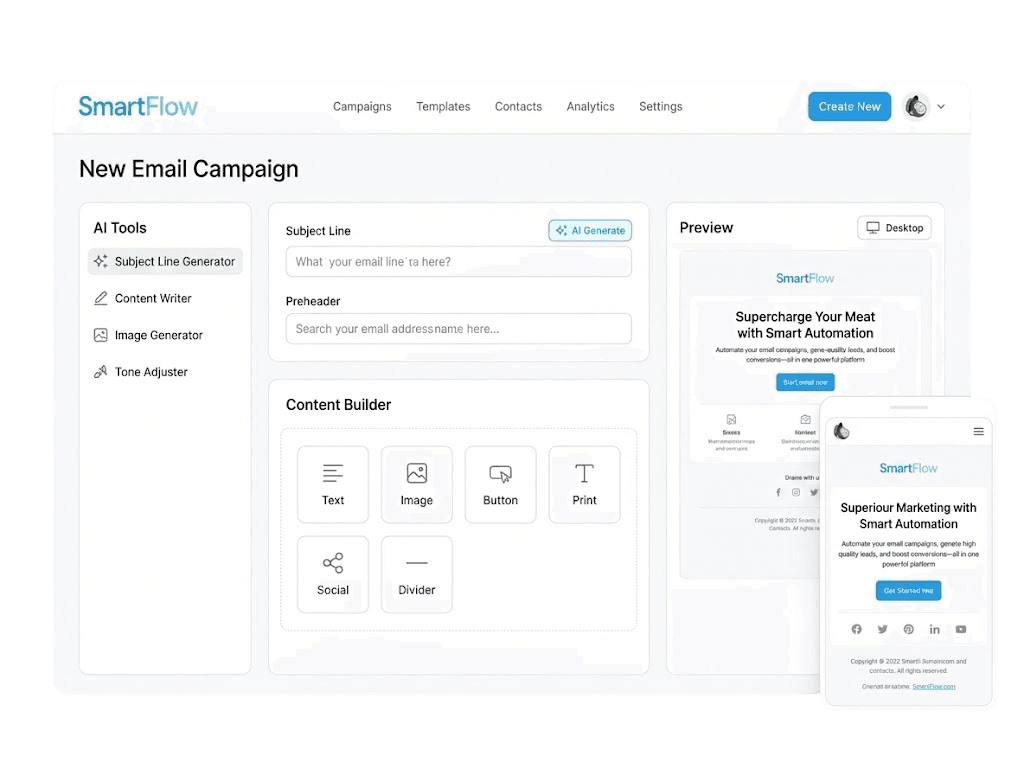 Smart Flow is an AI-powered marketing automation platform that helps you run email, SMS, and social media campaigns from one place. It’s designed to simplify marketing tasks and improve campaign performance.